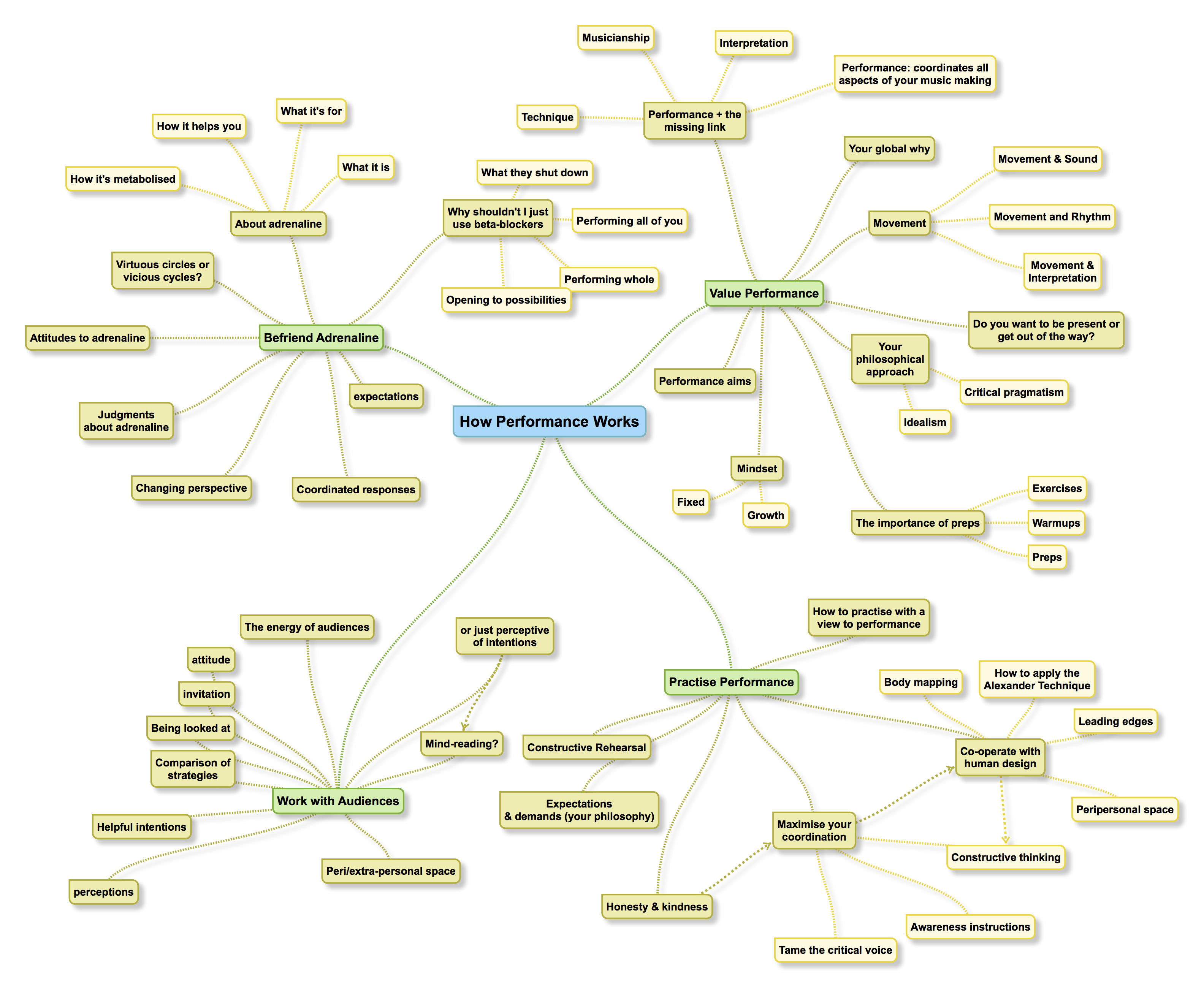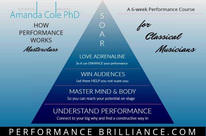 - Understand Performance: Get real about performance, Recognize performance as the fourth skill (along with technique, musicianship, interpretation) so you can connect to your big why, get co-ordinated and find a constructive way in.